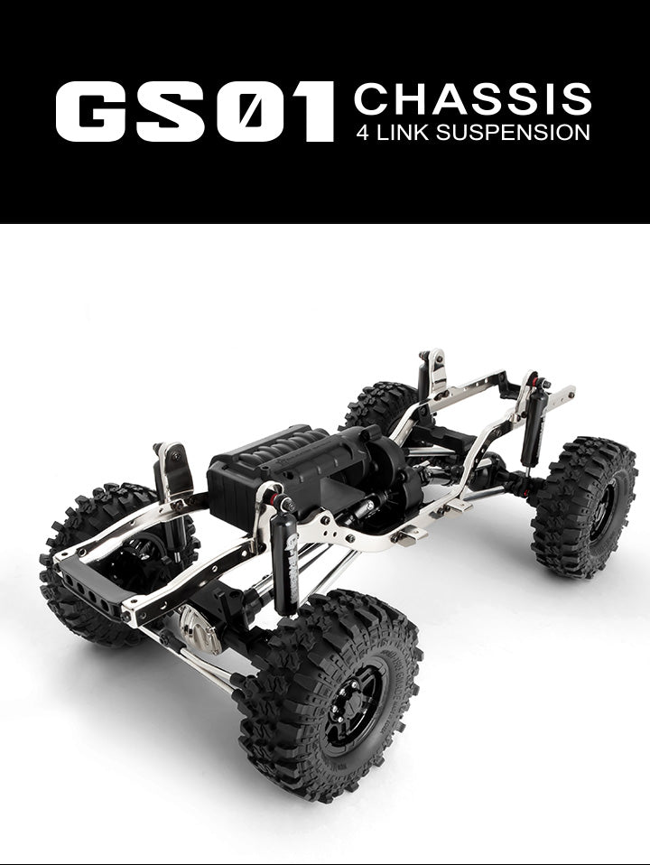 The Gmade Komodo GS01 Scale 1.9 Crawler Kit is built off of a steel, nickel plated frame and includes the awesome G-Transition internal spring shocks for unmatched scale detail and crawling prowess. Another feature that sets this truck apart from the crowd is the included scale accessories. Roof rack, snorkel, sand ladders, grille, heavy duty front and rear bumpers, rear view mirrors, windshield wiper grille, light buckets and more are all included as standard accessories to give you the most realistic experience possible.