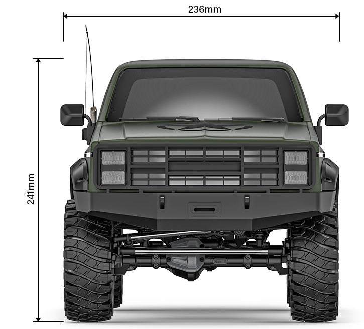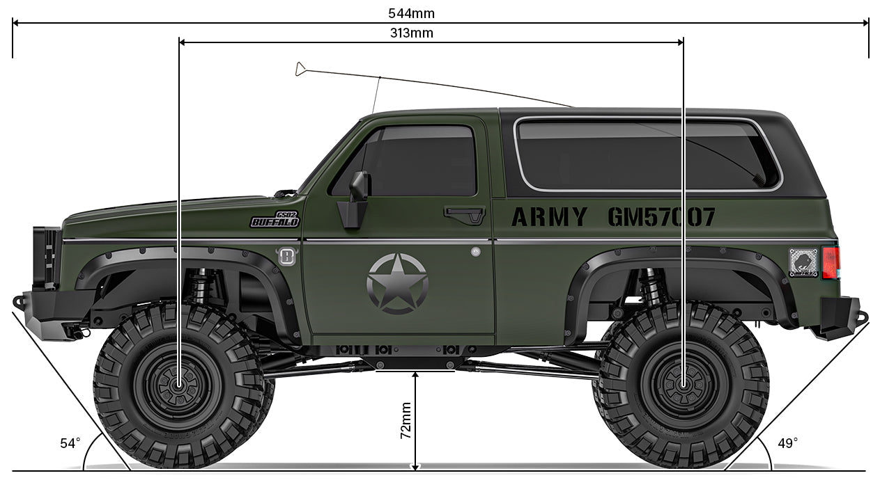 This is the GMADE 1/10 GS02F Military Buffalo TS Scale Crawler Kit (requires assembly plus servo, radio system, ESC, motor, and battery). GMADE is known world-wide for their design innovation and high quality. The Buffalo TS features a ton of high-tech, well made features designed to make a super rugged crawler that can take on the toughest conditions.