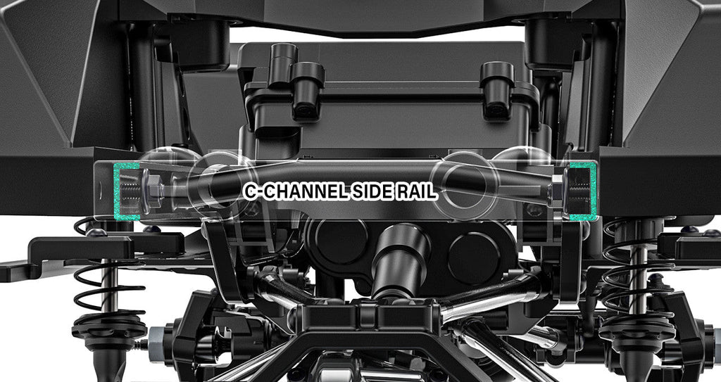 - GS02F frame is designed to look as a chassis of a real car frame and the material of the frame is made of high strength steel, C-channel side rail and is with hex wrench bolted with cross members, which make it resistant to twisting or warping. Also, steel parts are black powder coated finish to prevent rust.