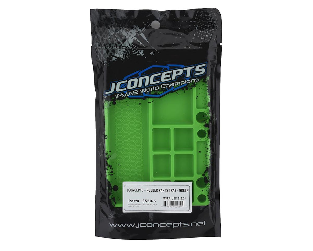 The JConcepts Rubber Parts Tray is a simple way to improve your pit performance and cut down on the headache of managing small parts. The precision molded rubber material has a nice weight and grip to it, keeping the tray in place on your pit table or garage workbench. The divided pockets provide secure spaces for organizing your small screws, bolts or whatever parts you need to keep in place for a project. The tray has six, built-in positions to place a differential for builds or fluid fills and can accommodate 1/10th and 1/8th sized assemblies. The iconic Dirt-Web tread pattern is raised into the surface of the largest cubicle and JConcepts.net logos blaze the outer perimeter to show brand authenticity. Available in multiple colors to stand out against any work clutter and visual static.