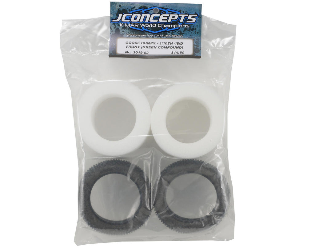 This is a set of two JConcepts Goose Bumps 2.2 Front 4WD Buggy Tires. The JConcepts Goose Bumps tire is just what the doctor ordered. The totally unique step pin and bar lug design combined with the sticky green compound allow even greater control on slightly loamy and wet conditions. The Goose Bumps are a special breed, designed for maximum performance when new or used as the design allows even wear all the way down to the tire body. Once the driver wears through the initial pin, a bar follows to maximize potential on aggressive surfaces.