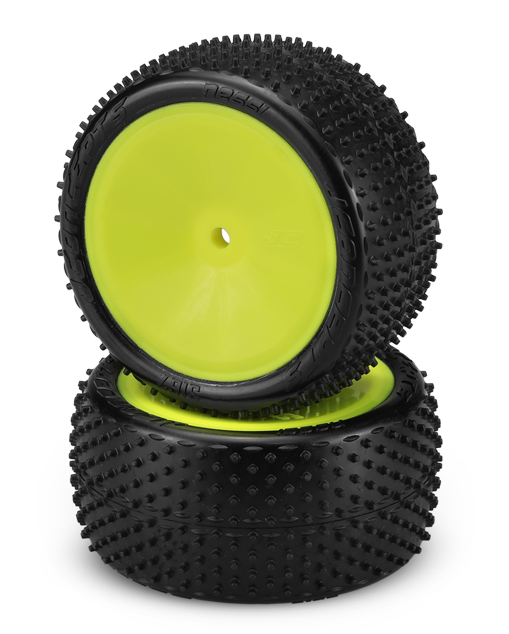 The pink compound marked with 2 pink dots on the tire represents a new compound for JConcepts, a medium soft material with good wear characteristics. The pre-mounted JConcepts tires include open cell, medium inserts for plush control mounted on #3348 Mono wheels available in bright white and florescent yellow.