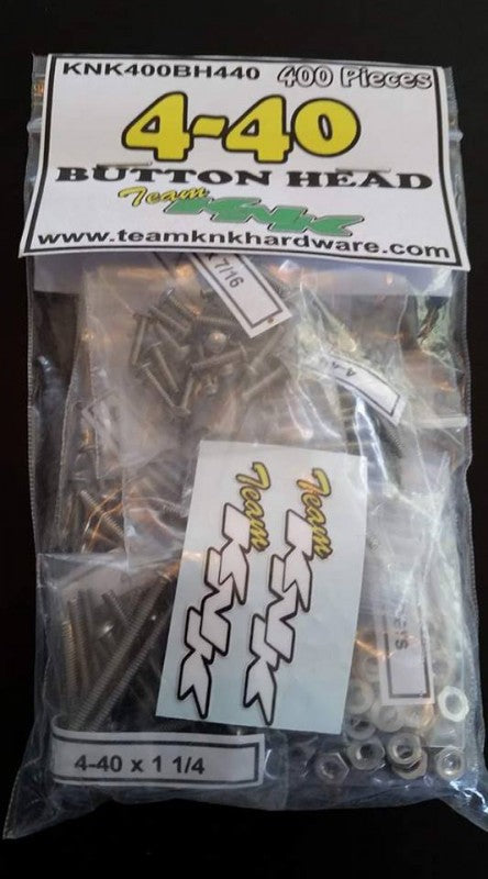 400 Piece Stainless Bulk Bag - (25) each 4-40 x 1/4, 5/16, 3/8, 7/16, 1/2, 5/8, 3/4, 7/8, 1, 1 1/4 and 1 1/2" Button Head screws, (50) 4-40 nylocks, (25) machine nuts and (50) #4 washers