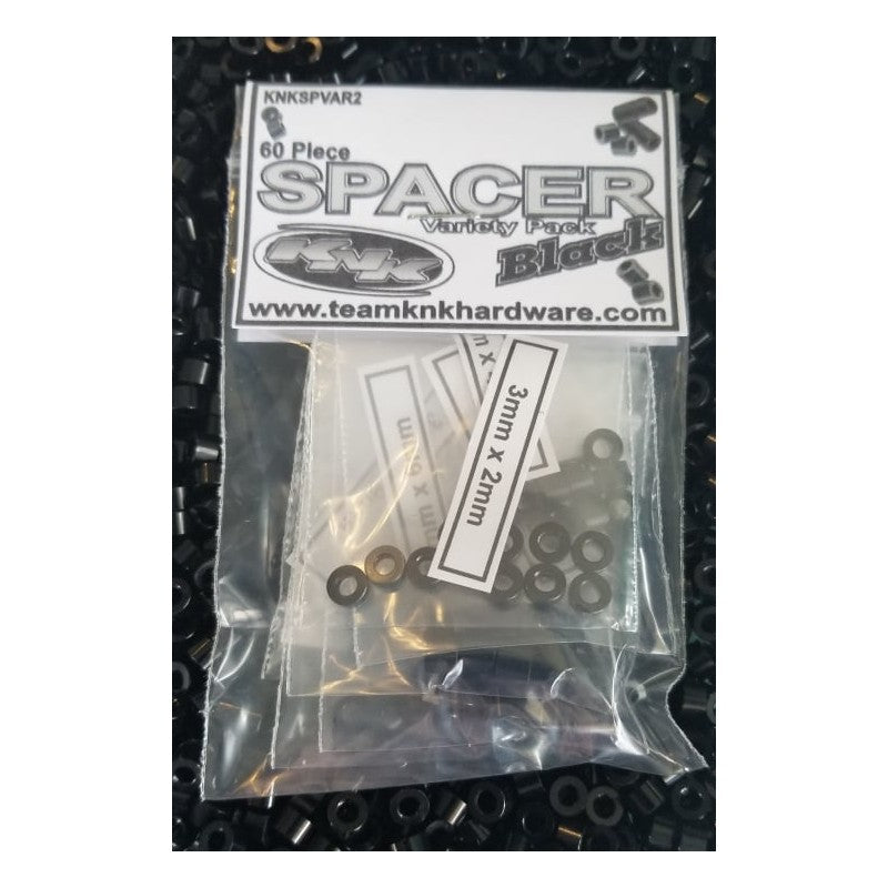 60 Piece 3mm Aluminum Spacer Variety Pack The KNK Aluminum Spacer Variety Pack is great to have on hand for any custom build. With a 3mm inner diameter and a 6mm outer diameter, these spacers can be used in a variety of applications and are great for shock mount spacers, link extensions, transmission spacers and any other use that needs a precision machined spacer. Package includes sixty spacers, in a variety of lengths.