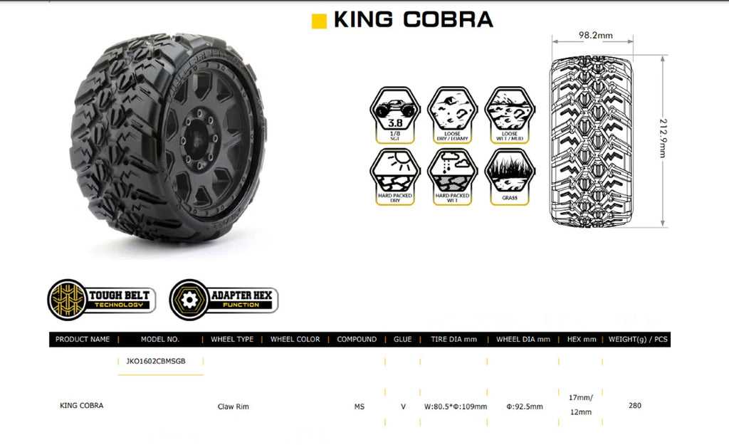 POWERHOBBY 1/8 SGT 3.8 KING COBRA BELTED MOUNTED TIRES W REMOVABLE HEX WHEELS (2)