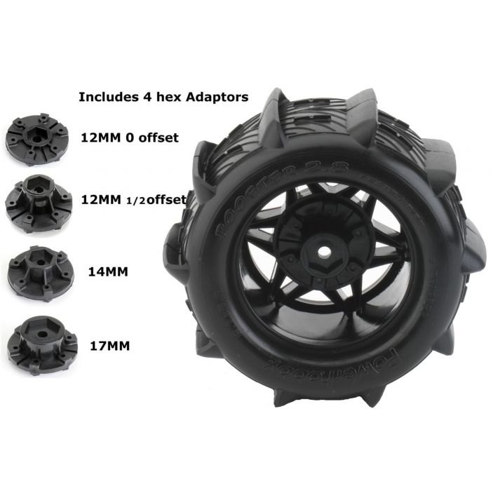 (12mm 0 offsets, 12mm 1/2 offset, 14mm and 17mm) with the included hex adaptors, these 2.8 tires will fit all 1/10 trucks including the Traxxas Maxx.