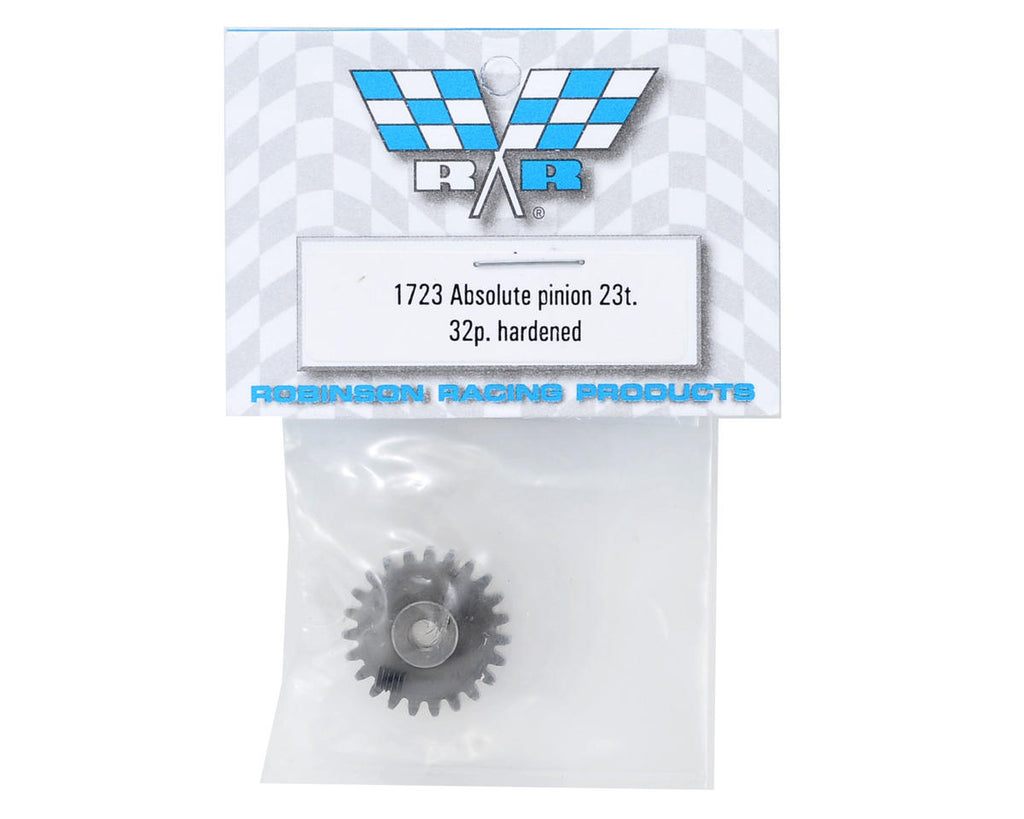 Robinson Racing Absolute 32 Pitch Hardened Pinion Gears are built to last, and are best suited for use with Robinson steel spur gears. They feature an 1/8 inch bore, a 32 pitch tooth profile, with the tooth number stamped on the side for easy identification. Choose from multiple options to fine tune the gear ratio of your vehicle. Package includes one gear and one 5-40 set screw.