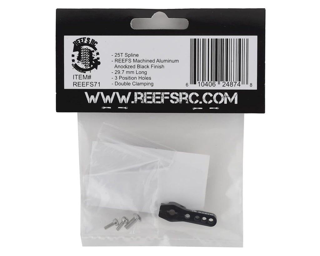 This Reef RC 25T Black V2 HD Servo Horn is made from hardened aluminum with a stealthy black coating. This servo arm is a strong and rigorously tested, with 25T Spline, three positions and a double clamping design.