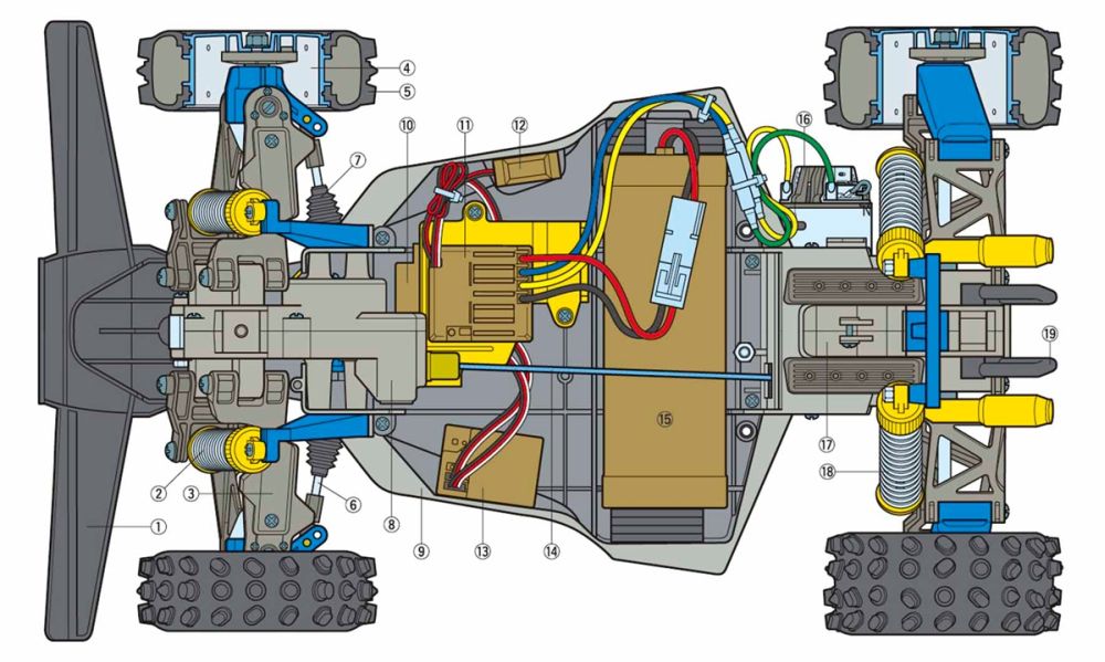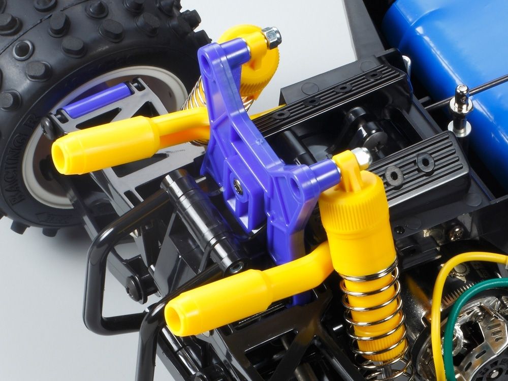 King of the Off-RoadThe extremely stable shaft-driven 4WD drive train has excellent efficiency thanks to full ball bearings, while differential gears ensure cornering is smooth. 4-wheel independent double wishbone suspension employs A-shaped front and H-shaped rear arms for excellent durability, with CVA oil dampers for high-quality suspension stroke. Dish wheels are not just aesthetically pleasing, but also practical on the off-road surfaces the Bigwig (2017) calls home; they are paired with grippy oval bock tires. The rack and pinion steering setup remain unique to the Bigwig among Tamiya R/C cars.