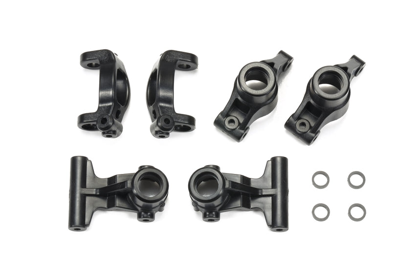 These are carbon fiber-reinforced nylon plastic C parts for the M-07 chassis. They exhibit stiffer flex characteristics compared to the standard plastic parts found in the standard kit.