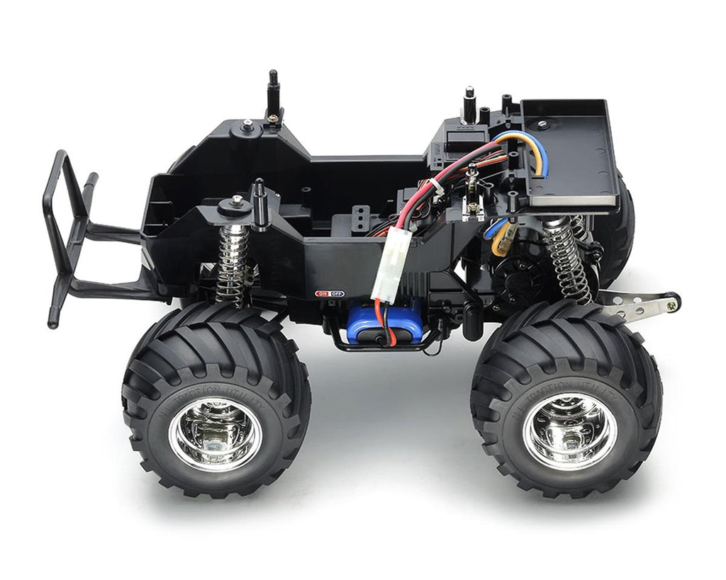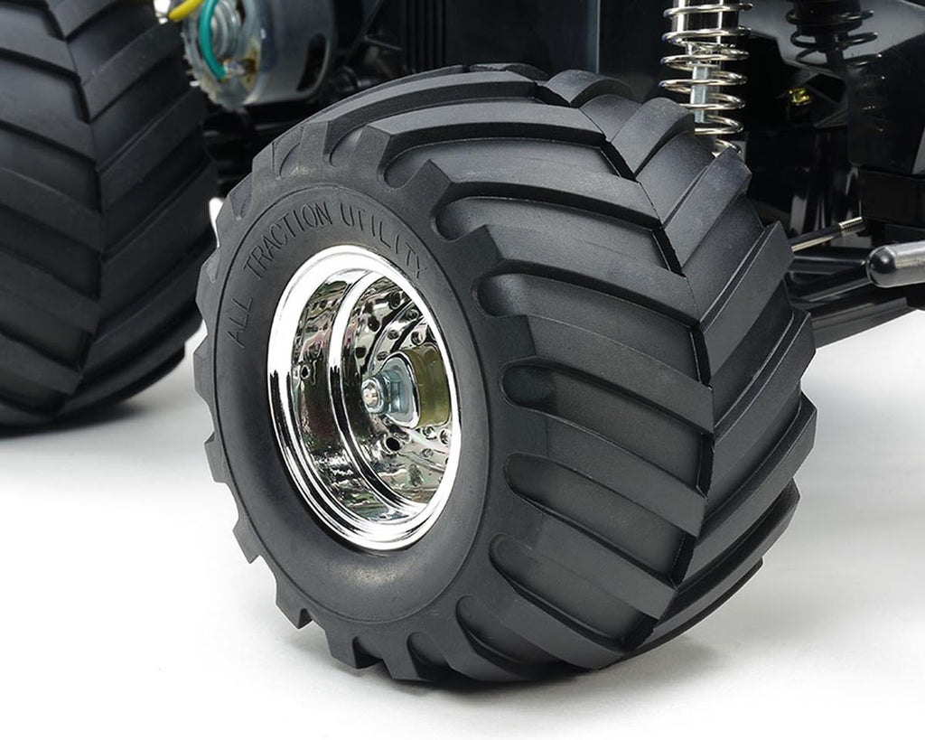 The Tamiya Midnight Pumpkin Metallic Special Monster Truck Kit is an updated version of a classic Tamiya vehicle. This model has been a Tamiya favorite thanks to its classic 1950’s pick-up truck style combined with oversized tires. With all the popular characteristics of the original, combined with a black-metallic body and silver-plated wheels for a more striking appearance. The body, and parts H and J are plated using an advanced vacuum plating technique. Other parts remain the same as original kit, with unique packaging used to easily distinguish this limited item from original kit version.