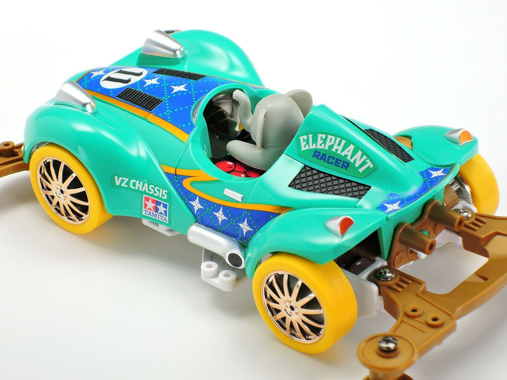 - Mini 4WD model assembly kit. - Classic car-inspired body is molded in a smooth shade of light green. - Features a pre-assembled and painted Elephant Racer figure. - The VZ chassis is molded in white ABS plastic, with gold color ABS A parts and white low-friction plastic bearings. - Copper color plated fin spoke wheels are paired with hard tires molded in yellow. - Dedicated stickers are included in the kit to decorate the body. - Type 130 motor is included. The model features a 5:1 gear ratio. - Two AA batteries are required (sold separately) - A wide range of Grade-Up Parts is available separately to customize your machine.